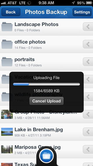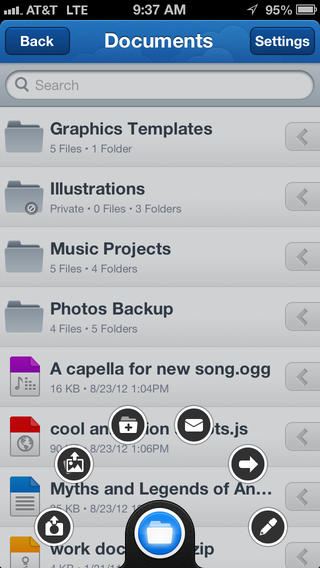 Мобильный клиент MediaFire мало чем отличается от приложений других облачных хранилищ: позволяет просматривать миниатюры хранящихся файлов, скачивать файлы в память и загружать их в облако из локального носителя. Встроенный файловый менеджер выполняет все стандартные действия: перемещение, переименование, удаление файлов, копирование публичной ссылки, отправка в социальные сети. Здесь же можно указывать уровень доступа к папками и файлам: приватный или общий. С общими документами может работать не только сам пользователь, но и его коллеги.