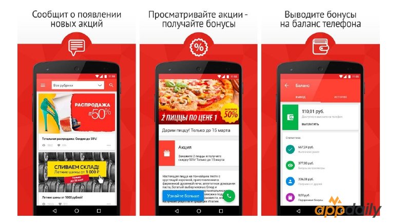 Рекламодатели платят за то, что приложение оповещает пользователей о новых акциях, именно эти деньги идут на пополнение баланса смартфона за просмотр каждого объявления. Интерфейс приложения позволяет сразу же перейти в магазин или на сайт компании, чтобы получить подробную информацию или воспользоваться выгодным предложением.
