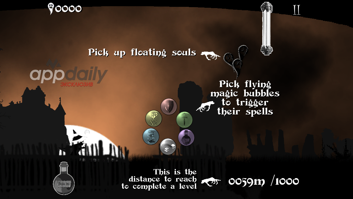 Однако, Umbra имеет небольшой перечень заклинаний, которые можно приобрести или модернизировать, собирая души. Например, Umbra может превратиться в оборотня и получить иммунитет к определенным препятствиям, или же замедлить время и восстановить здоровье. Изначально будет доступна только первая локация. Чтобы разблокировать следующие, игрокам необходимо будет преодолеть определенное расстояние на каждом из уровней. Все 5 уровней имеют собственный стиль со своими существами и препятствиями. Они также имеют собственные испытания и еще более сложные задачи. Когда игрок разблокирует новый уровень, он также откроет бесконечный режим, где сможет состязаться с другими игроками, устанавливая новые рекорды.