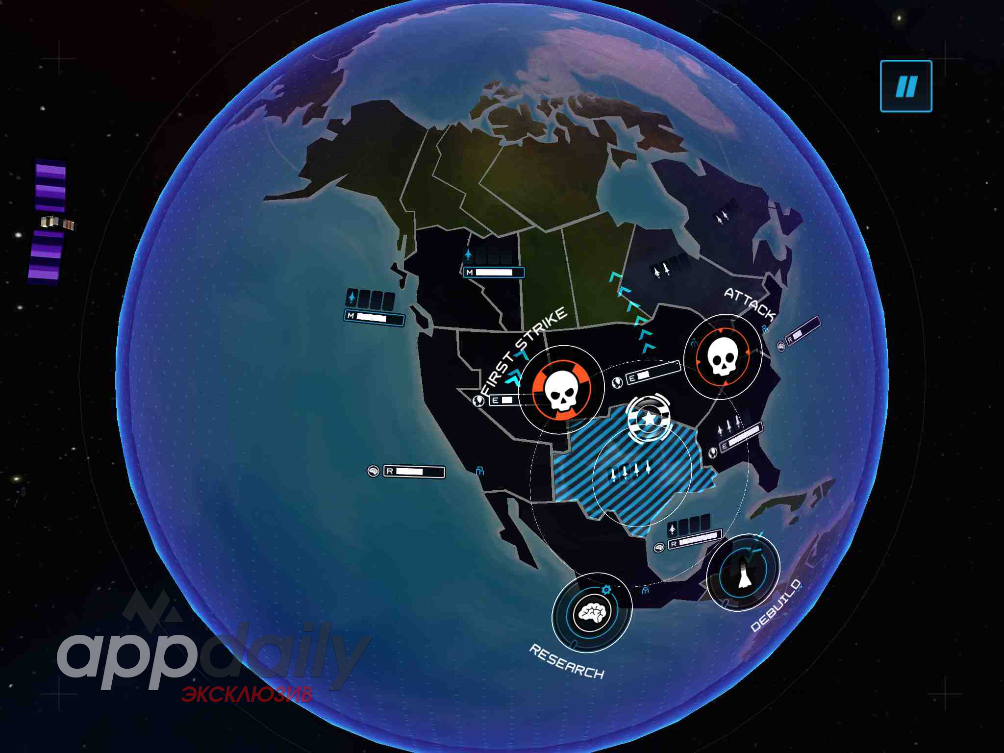 После выбора сверхдержавы предстоит развивать страну, расширять ее границы, исследовать новые разработки (а дерево развития в игре довольно обширное) и наращивать огневую мощь. Управлять всеми этими функциями очень просто: планету можно вращать свайпами, увеличивать и уменьшать масштаб, а выполнять все действия мы будем всего в одно касание. Например, чтобы изучить новые технологии, достаточно просто нажать на одну из наших территорий и из выпавшего меню выбрать «Research», а чтобы атаковать достаточно пару секунд подержать палец на вражеской территории и вылетит ракета. А если вы очень сильно рассердите кого-то, то в вас полетит так называемый «Первый Удар» - огромное множество ядерных ракет, которые не оставят от державы игрока и мокрого места. Но что вам запрещает первым нанести такой удар? Простым в этой игре является только управление. Сам же игровой процесс очень разнообразен: ситуация на политической карте будет постоянно меняться, искусственный интеллект противников не раз заставит вас подумать, как же правильнее поступить. Создадите ли вы свой альянс и покажете всем, кто на самом деле является вершителем судеб, или же падете под гнетом могущественного противника – все зависит только от вас.