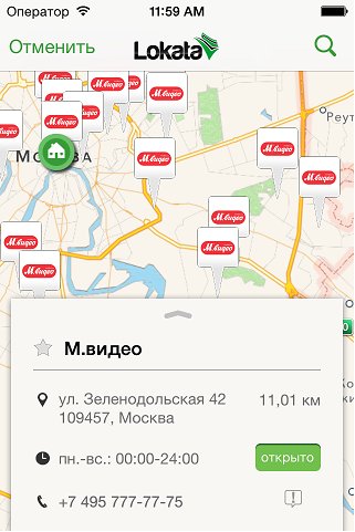 Первое, что вы увидите после установки Локаты – удобное вертикальное меню, которое легко открывается движением пальца вправо или влево. Вы сможете настроить пользовательский фильтр, после чего можно приступать к изучению магазинов и их электронных каталогов. Расположение магазинов можно посмотреть на карте, причем отдельной карточкой вам покажут контакты магазина и часы его работы. Сервис определяет ваше местоположение автоматически, так что Lokata – еще и отличная палочка-выручалочка по поиску магазина на местности.