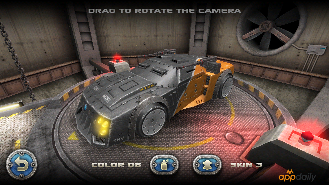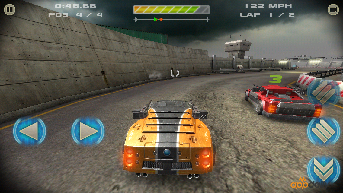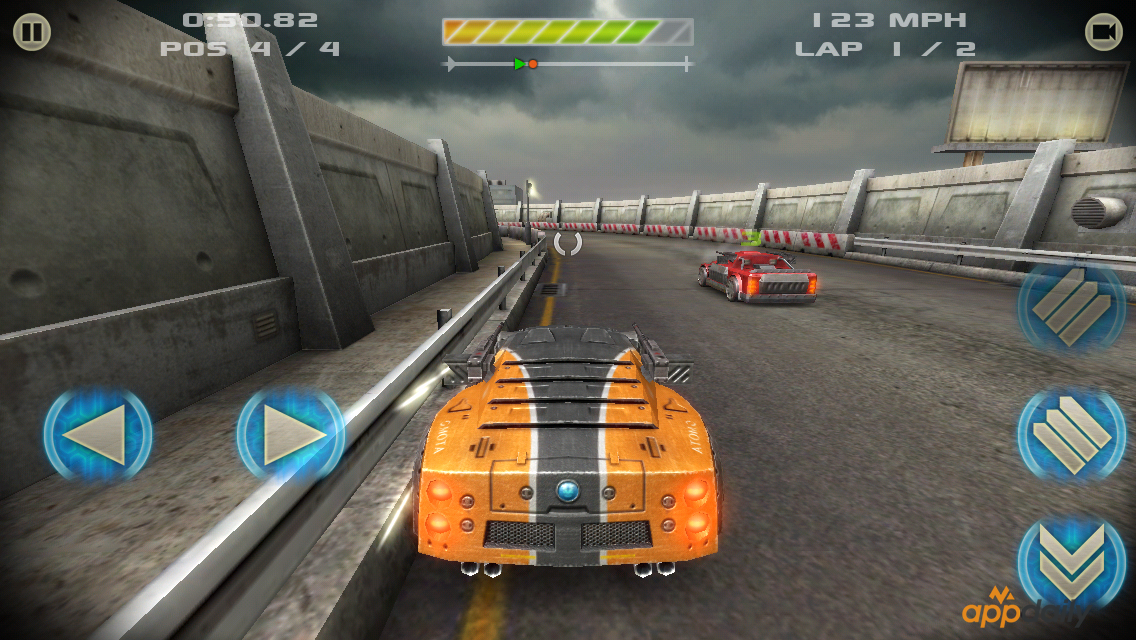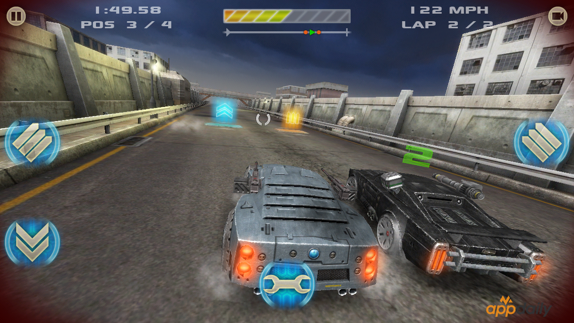 Сами постапокалиптические гонки предлагают нам соревнования, где ваша задача обойти соперников используя все доступные вами средства: различные виды оружия, которые вы можете улучшать по мере гонок, естественно за игровые монеты, добытые по мере гонок. Но не стоит забывать о том, что вы так же станете объектом для нападения. Ваши соперники так же будут применять оружие или защиту против вас. В режиме «Улучшения» игрок сможет улучшить свой автомобиль и покрасить его в любые доступные цвета. Например, как моя машина – в цвета AppDaily. Всего для разблокировки будут доступно 9 автомобилей и представлено с одним десятком трассы «18» – пока я играл у меня была одноэтажная трасса, проходя уровень сложность увеличивается – соперники становятся все злее и быстрее. На самой дороге разбросаны бонусы: ускорение и патроны, которые используются для атаки соперников. Время от времени появляются денежные вознаграждения.