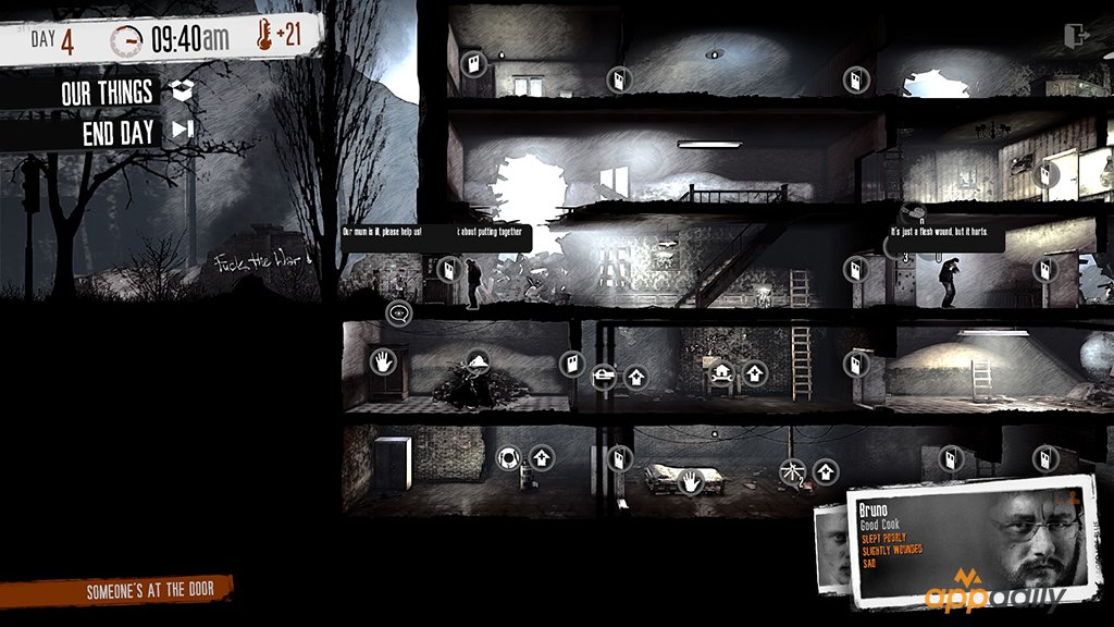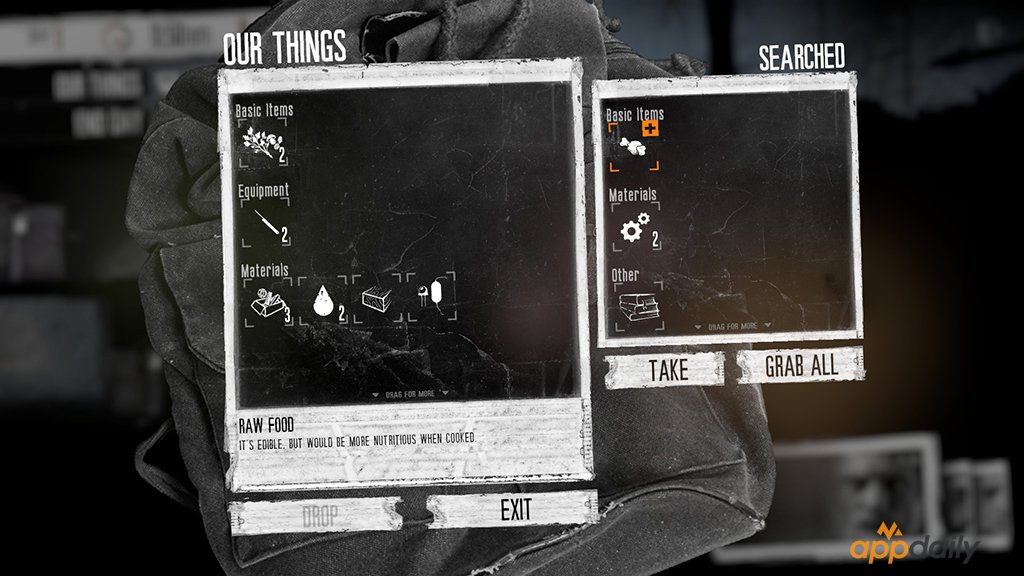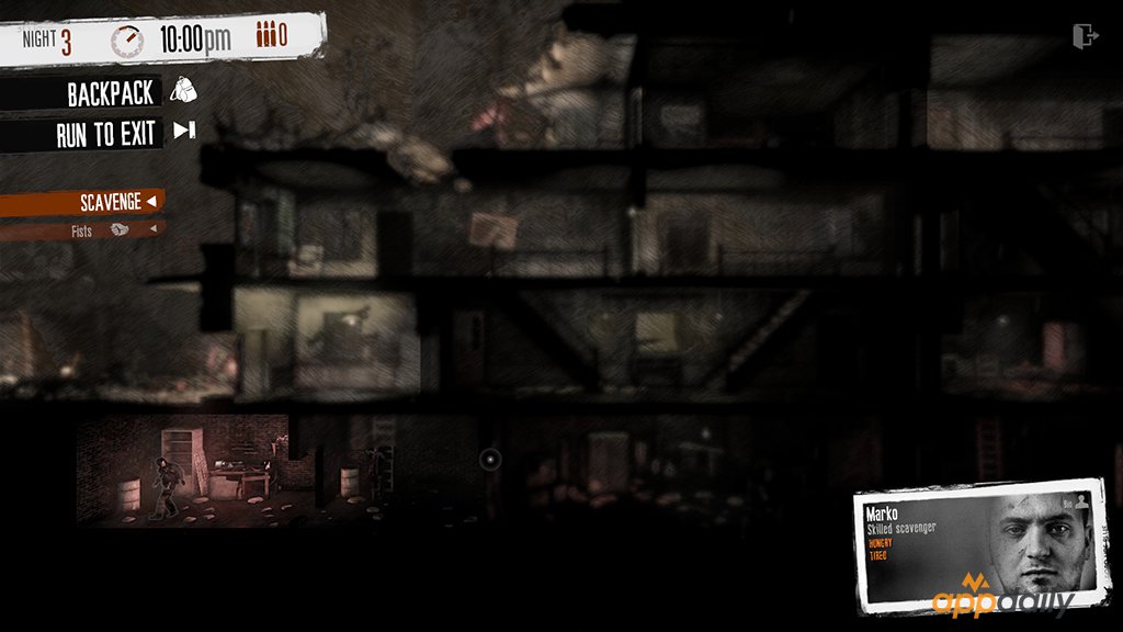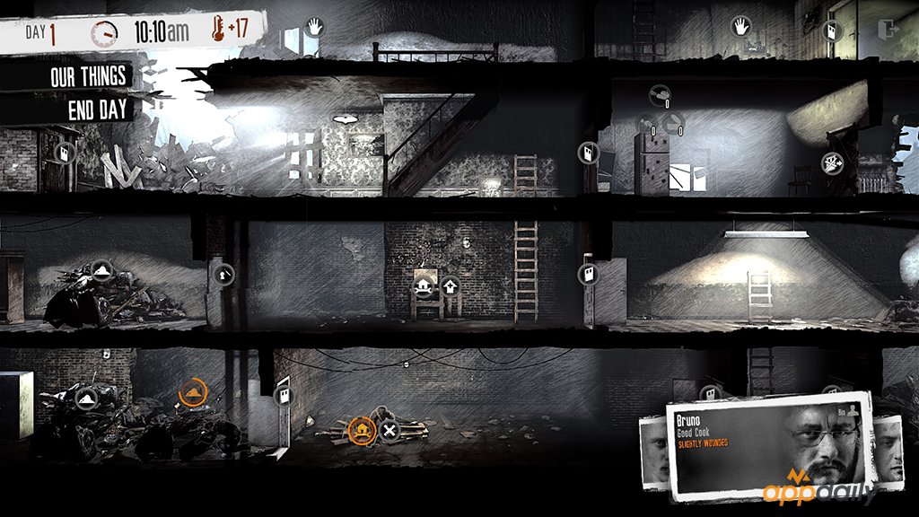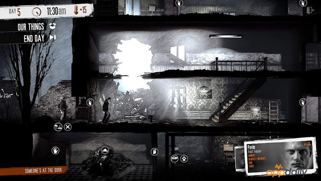 Игра выполнена в стиле нуар, темнота и рисованная графика великолепна. Сам геймплей прост и привлекателен, нажимая на иконки действия, выбрав одно из героя вашей группы, вы направляете их в то место, где им что-то надо сделать: открыть дверь, вскрыть замок, покопаться в мусоре в поиске продовольствия, установить только что сделанный предмет. Выходя на поиски в другие районы, проходит смена дня и ночи, ночью мы выходим на поиске продовольствия и важных предметов – но надо быть осторожным так как другие группы, могут напасть нас вас и убить. Каждый район, каждое здание имеет свои опасности, в поисках нужно быть внимательным, чтобы не попасться и не быть убитым, в этом случаи группа лишиться одного человека – они действительно начнут переживать за потерю друга. Не стоит забывать – все реалистично: им надо спать, им надо есть, им надо много чего чем и должен заняться игрок – следить за своей группой. Вы сможете обмениваться предметами с другими людьми, стучащие в вашу дверь. Мне очень понравилось, нас определённо ждет уникальный геймплей – где за каждым из группы глаз да глаз. Не дать заболеть, направить поспать, растопить печку, сделать покушать и выбрать кто пойдет в другой район – все в ваших руках.