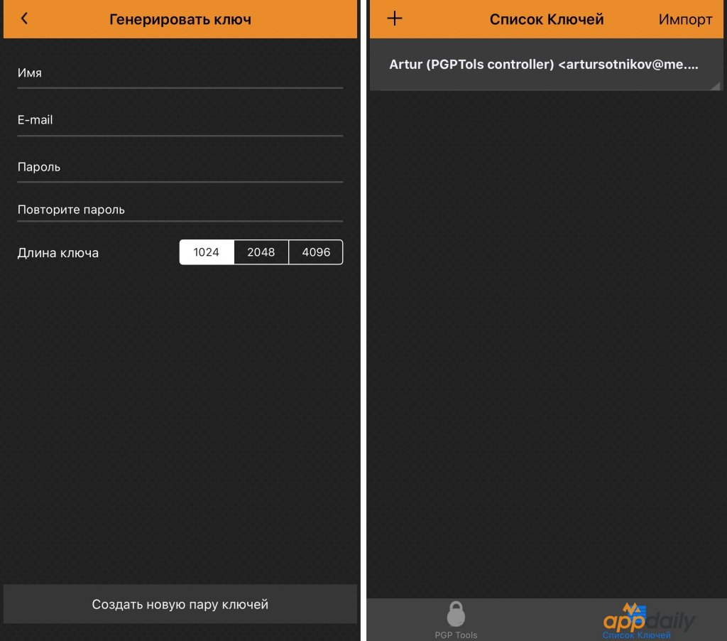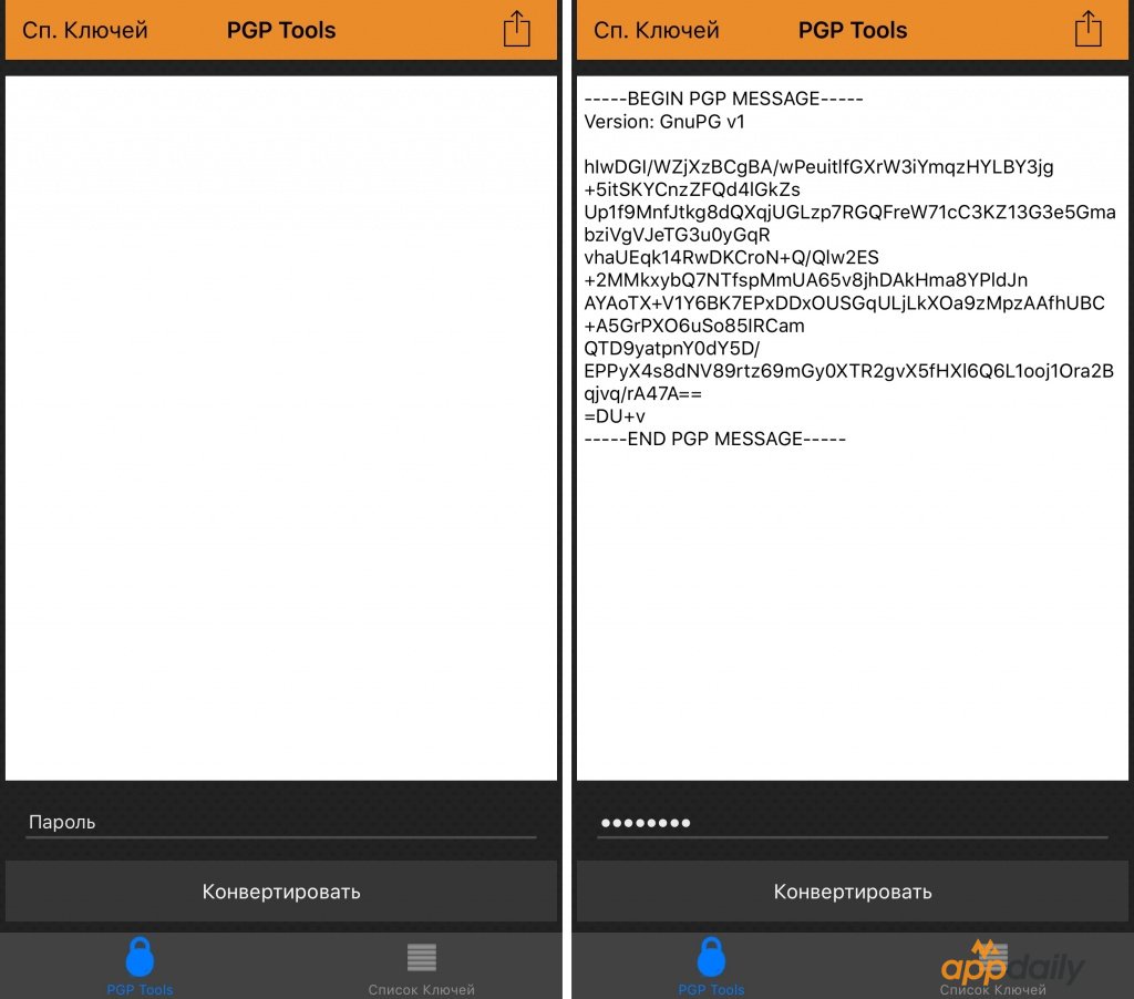С приложением PGPTools пользователям совершенно не нужно подолгу разбираться в правилах и настройках. Открываете, генерируете код и высылаете послание с ключом адресату.