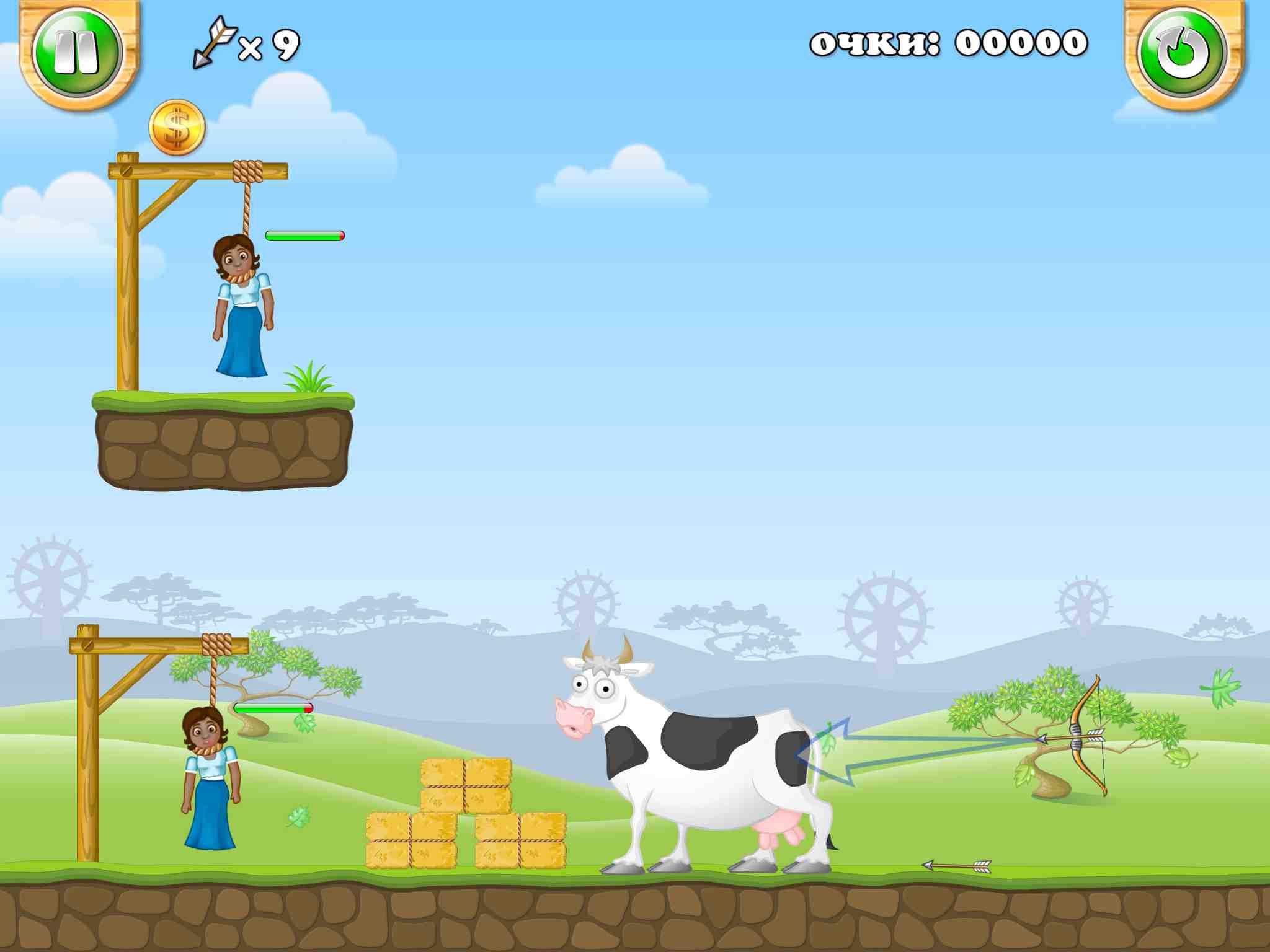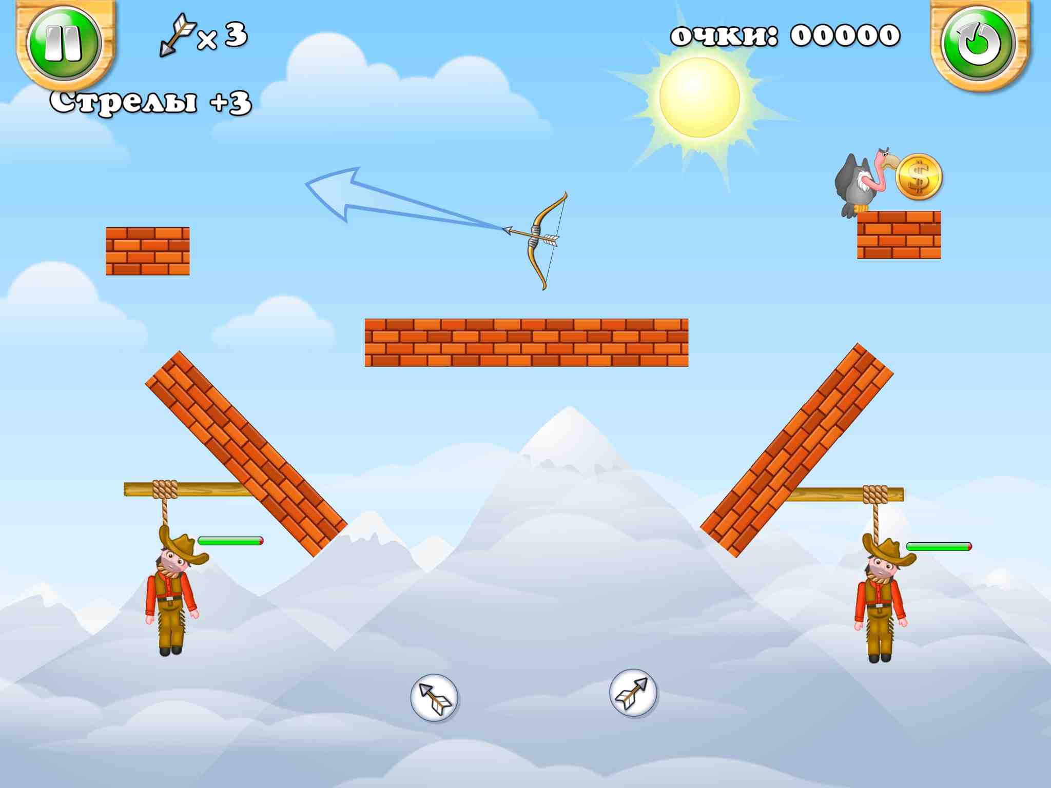 Начало каждого уровня, по сути, одинаковое. Мы видим нескольких умирающих ребят, которые повешены на виселицах, и лук, который магическим образом висит в какой-то точке на экране. И главным отличием от той же Angry Birds является наличие таймера, за время которого мы должны пройти уровень и спасти всех висельников. А в роли таймера тут выступают жизни бедолаг. С каждой секундой количество здоровья у них уменьшается, и они умирают, перекрашиваясь при этом в темно-синий цвет. Наша задача – успеть перерезать все веревки. Попадание по веревке – житель спасен. Попадание же по жителю наоборот убивает его и уменьшает количество здоровья до тех пор, пока либо вы не убьете его своей очередной стрелой, либо он не задохнется. Идеальным уровнем считается тот уровень, в котором вы ни разу не задели бедняг, висящих на веревках, и успели перерезать все веревки. При этом на уровнях разбросаны различные бонусы в виде монеток, которые также рекомендуется собирать, так как за них можно пройтись по здешнему магазину и накупить себе разных ништяков. Попасть по веревкам нам будут мешать ну очень неудобные рельефные изощрения, ящики, коровы и даже солнце! Помимо всего вышеперечисленного, на уровнях мы сможем найти колчаны со стрелами (а количество наших стрел ограничено, не стоит забывать об этом), дополнительные стрелы, которые будут вылетать из заданной точки в нужном направлении, если мы конечно же попадем в такой значок обычной стрелой, и даже телепортаторы, которые перемещают сам лук в другое место. И так на протяжении огромнейшего количества уровней, коих здесь несчетное количество.