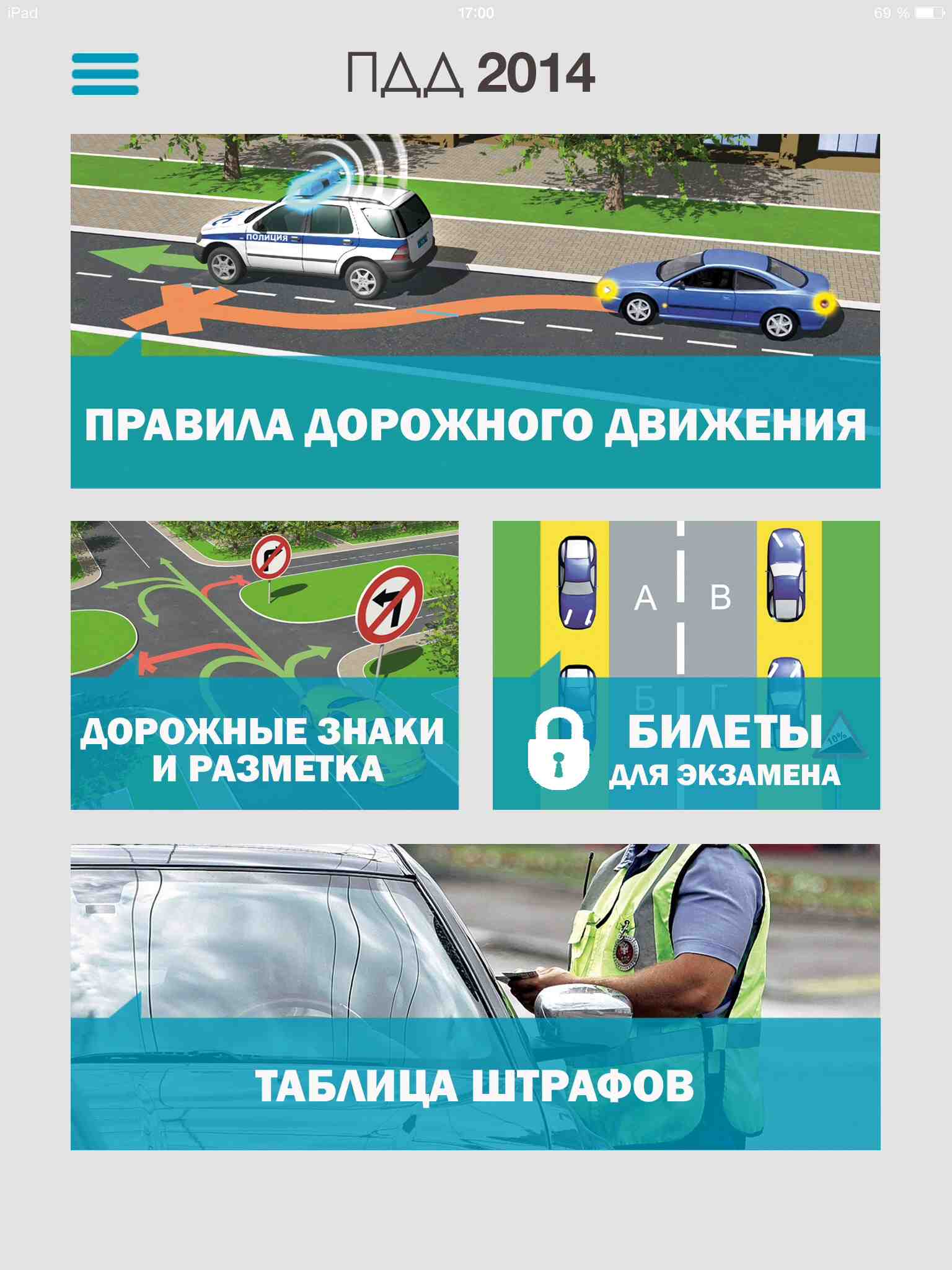 Представлено в программе все очень просто. Здесь есть несколько разделов, группирующих в себе все нужные нам сведения с комментариями. Первым идет «Правила дорожного движения», где собраны все основные положения об использовании автомобильного транспорта, о поведении пассажиров и пешеходов, перевозке грузов и много чего еще. Следующее – это «Дорожные знаки и разметка». Если вы совершенно неожиданно для себя обнаружили, что не знаете обозначения недавно увиденного знака – то вам сюда. Здесь собрана информация по всем существующим, часто и редко используемым знакам, в том числе и дорожные разметки. Далее «Таблица штрафов». Если вы вдруг, не дай Бог, нарушили какое либо правило, не уверены в честности товарища полицейского, или же просто хотите узнать сумму штрафа, то тут собрана самая полная и законченная информация вообще обо всех видах наказаний. Стоит заглядывать сюда почаще, если вы любитель нарушать правила дорожного движения. Заключением идет пункт «Билеты для экзамена». Сразу стоит отметить, что этот пункт платный, и стоит он, только не смейтесь, 33 рубля. Да да, за 33 рубля вы получаете доступ ко всем 800 вопросам экзаменационных билетов. В то время, как конкуренты предлагают космические суммы, «ПДД 2014» предлагает полный перечень билетов за сущие копейки. Сдающим на права обязательно стоит приобретать. А в нашей группе в ВК конкурс - промо код к приложению.
