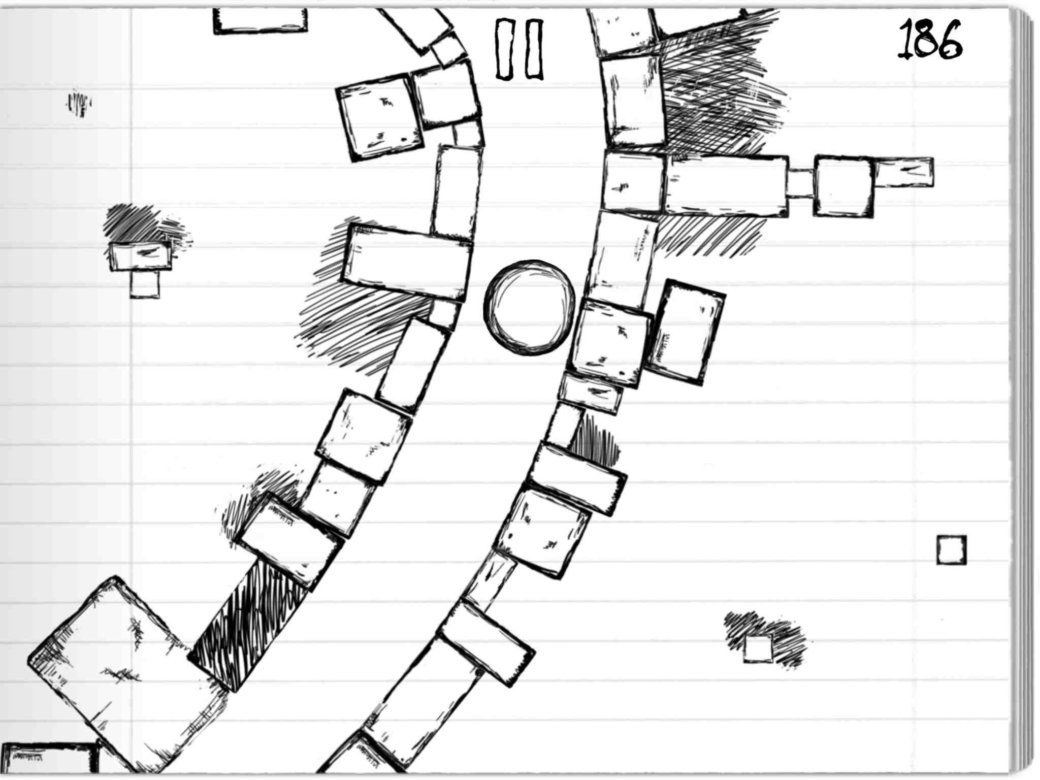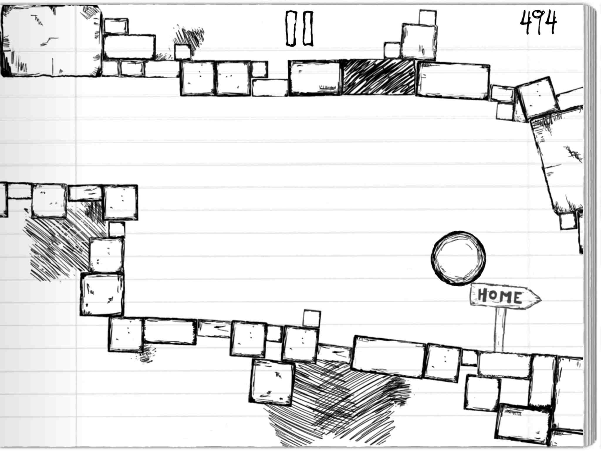 Самое поразительное в Roll Back Home – это ее необычная, нарисованная графика. Выглядит все так, будто игра была нарисована на тетрадке в клетку карандашом: все уровни, эффекты, объекты и так далее. И вот на протяжении игры мы будто бы быстро листаем эти изрисованные страницы тетради и передвигаем наш шарик, на манер мультиков, нарисованных в 80х годах, когда отсутствовала компьютерная графика. Выглядит это очень занятно и интересно. Управлять же мячом нам предстоит наклонами своего устройства. Если на iPhone и iPod это довольно просто, то на iPad вызывает некоторые трудности, хоть и прорисовка с поддержкой Retina и держит графику на уровне. Для передвижения, как я уже сказал, мы наклоняем устройство и тем самым регулируем скорость мяча. Чуть попозже нас научат прыгать, либо тапом, либо наклоном устройства вперед, что вам по вкусу.
