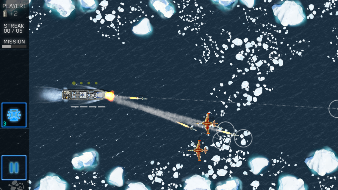 По мере продвижения наша задача: как можно больше собрать с битой вражеской авиации, которые просто кишат над вами, сбрасывая на вас различные виды бомба, собрать «горючее». Мы так же должны защитить наш собственный корабль сбивая наведенные на нас ракеты. Управление весьма интересно выполнено с помощью «тач», тыкая пальцем по экрану мы выпускаем собственные ракеты, в то место куда, мы выбрали. Что касается «ассортимента» вражеских юнитов, оно весьма разнообразно. Нам предстоит на протяжении более 30 уровней воочию увидеть массы различных вражеский авиаций, через каждые пять уровней нас ждет мощный Босс, которого на фуфельном корабле так просто не потопить. Так что позаботься о том, чтобы твой корабль был мощно вооруженным и защищенным.