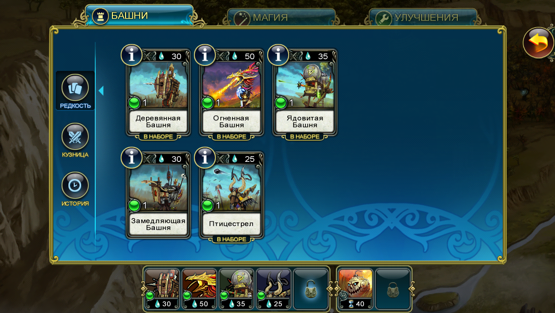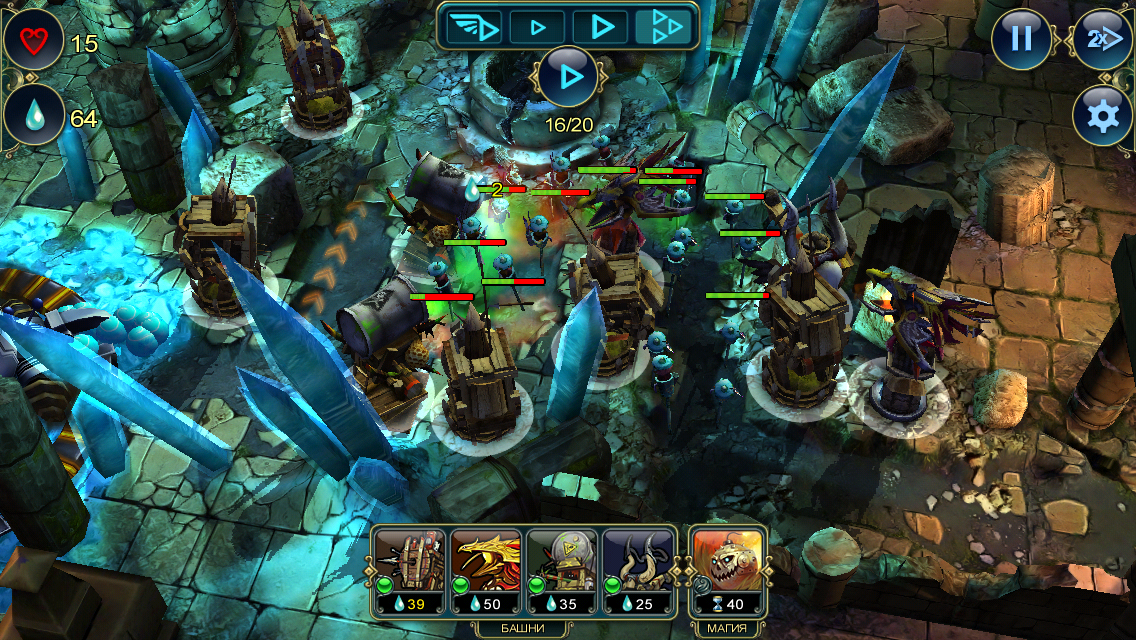 Ига имеет различные виды башен – которые мы сможем по мере игры улучшать, скрещивать что-то с чем-то, чтобы получить более мощное оружие. Вот тут то нам и понадобятся «Карты», с помощью их мы можем играть с башнями, улучшать, делать их более эффективными. Враги собственно тоже не стоят на месте: количество врагов и их классов массы – могут быть и весьма слабые атаки, а может и прям навалится волна массивных врагов: Боссов, тут и надо подумать, как установить башню в том месте где она больше будет эффективной. Все это идет с русским языком, и с русской озвучкой, вот это действительно круто, по-моему это первая игра с русской озвучкой в App Store. Различные веселые реплики не дадут нам заскучать, разработчики постарались на славу, прекрасный игровой механизм и сам жанр затягивает игрока до полуночи. Хотя она не слишком сложная. Сами же башни разделены на свои классы, каждый со своими способностями, да еще мы имеем и магию, ну не очень сильную, орудием будет быстрее, магия полезна на кучку монстров. Используй все доступные тактические приемы и найди лучший сценарий прохождения каждой миссии.