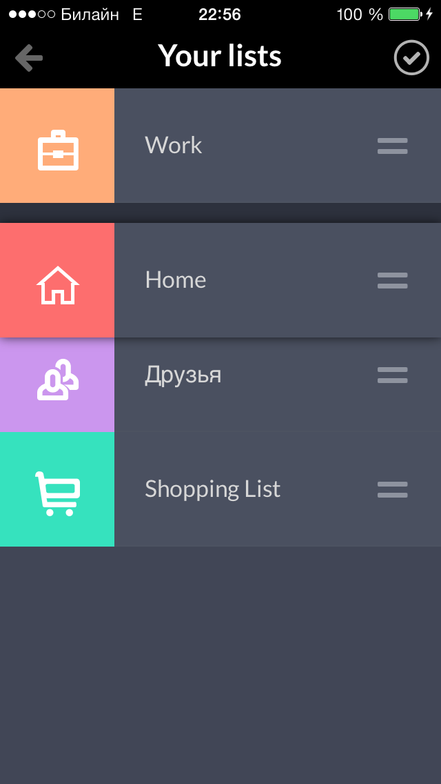 Сами же заметки разделены на различные группы, идея хороша, все по своим полочкам: например, выбрав «Home» мы можем выставить задачу по домашним делам. Всего же разделов в приложении не много, но самые нужны – «Дом», «Работа», «Друзья» и конечно же «Список покупок», по-моему самый нужный пунктик. И все это чудо в прекрасном исполнении по дизайну и эффектам. Всего одним движением мы вызываем пункт «Новой Задачи» или же любое другое действие – все плавно и красиво. Taasky имеет редактируемые цветные списки, благодаря которой вы никогда не забудете то что задумали, у вас теперь всегда все под контролем. Мы можем выставит более приоритетную задачу и на экране она будет в большом окошке.