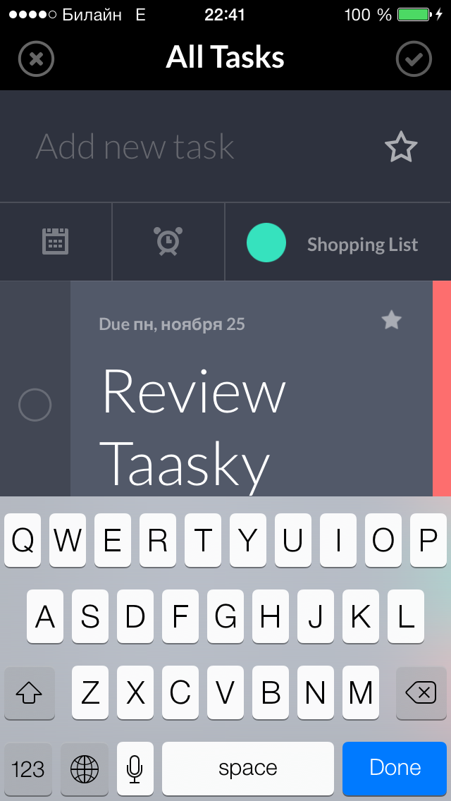 В преддверии грядущих праздников в голове сложно уложить все свои задачи, ведь человек может и забыть: вспомнить только в самый момент. На выручку различных задача или планов нам придет весьма интересное приложение Taasky имеющий прекрасный пользовательский интерфейс. Благодаря данному приложению имеющею поддержку iPhone и iPad, мы никогда ничего не забудем. Ведь Taasky это в прежде всего умный менеджер задач, позволяющий одним движением задать новое напоминание и выставить дату, даже время напоминания имеет смысл поставить.
